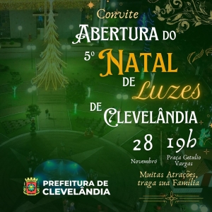 A Prefeitura Municipal convida toda a população para celebrar juntos a abertura do 5º Natal de Luzes de Clevelândia! Venha viver esse momento especial, cheio de encanto, luzes e muita emoção para toda a família.